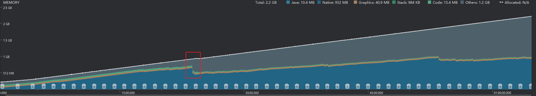 图为drawcall为100时,内存在60分钟内无任何操作的变化情况,图中的gc是自动的。