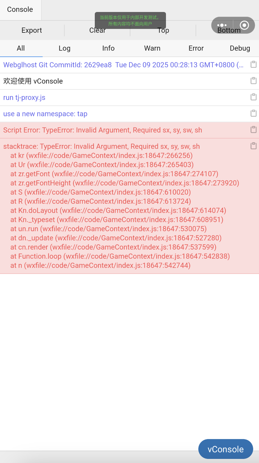 游戏工程导出为wx小游戏, 然后按照tap官方说明转换为tap小游戏, 在安卓设备tap平台运行时, 一旦渲染文字就会报错, 如图1