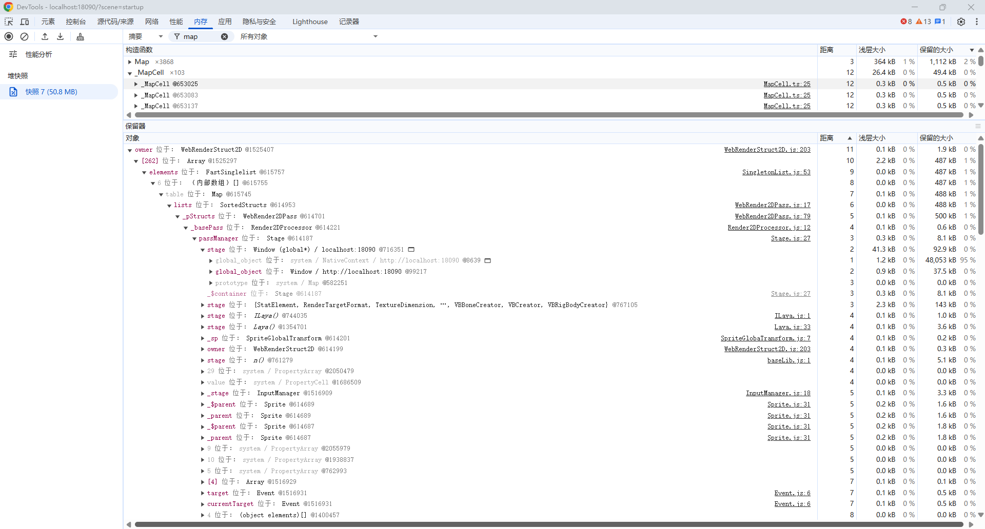 MapCell为地图块单元,退出地图时清理了销毁了所有地图块和引用,但内存快照还是存在该对象,查看了对象路径,未查到原因。官方看看是否引擎BUG导致?